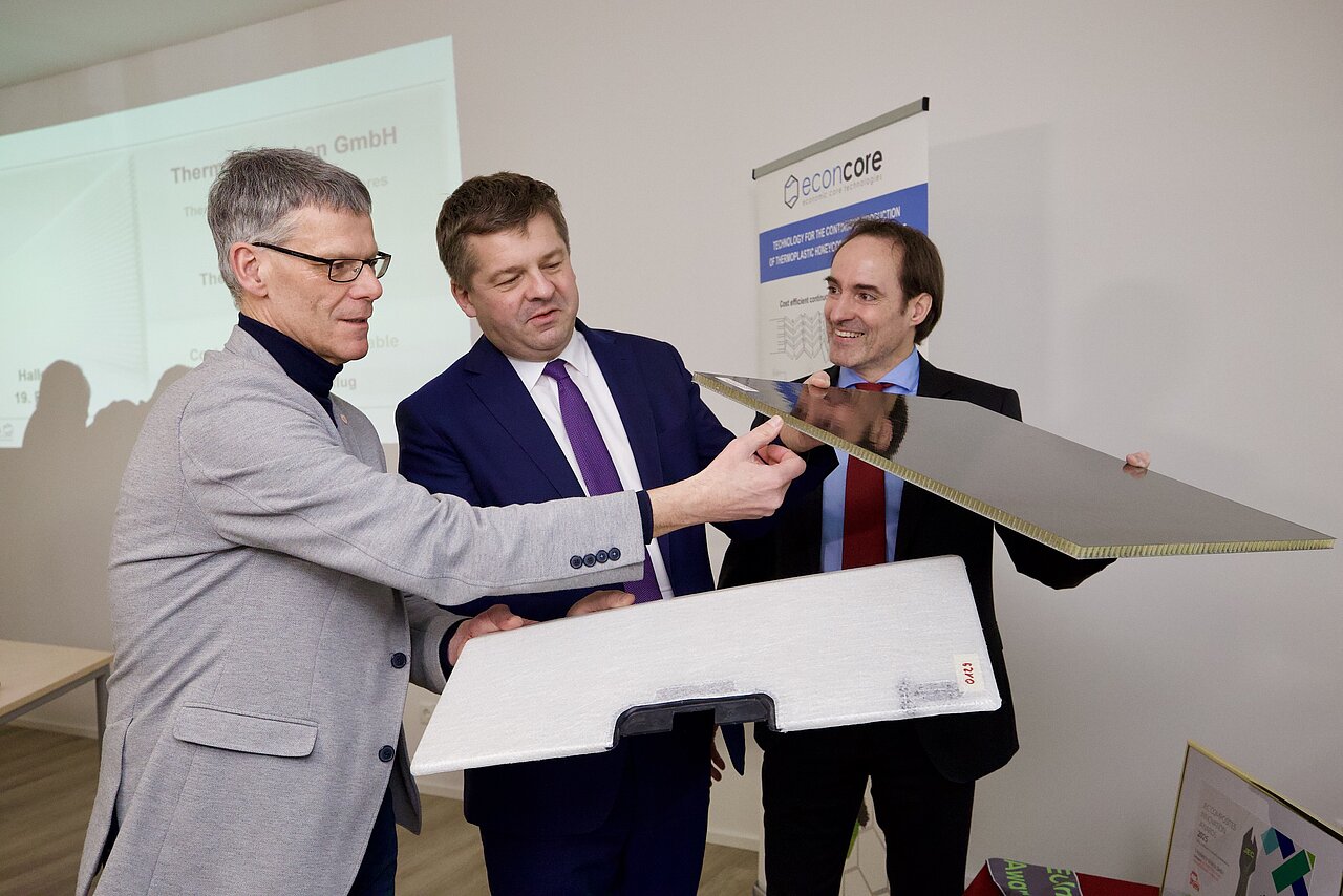 (halle.de/ps) Die ThermHex Waben GmbH in Halle (Saale), Merseburger Straße 235, hat Bürgermeister Egbert Geier am heutigen Mittwoch, 19. Februar 2025, gemeinsam mit Sachsen-Anhalts Wirtschaftsminister Sven Schulze besucht. Anlass der Visite bei dem Produzenten von thermoplastischen Wabenplatten war die offizielle Inbetriebnahme der erweiterten Produktions- und Büroflächen. Zudem hat das Unternehmen seine Hauptentwicklungsabteilung vom Standort im belgischen Löwen nach Halle (Saale) verlegt. Rund eine Million Euro werden investiert.