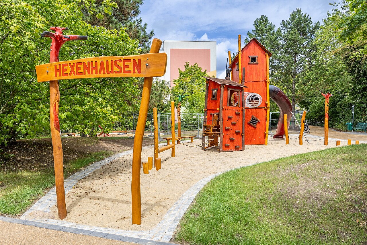 Der frühere Spielplatz „Wiener Straße“ aus den 1990er Jahren hatte sich in den vergangen Jahren in einem immer schlechter werdenden baulichen Zustand befunden. Viele Spielangebote wurden aus Sicherheitsgründen entfernt. Bei der aufwändigen Neugestaltung des Areals seit Januar dieses Jahres zu einem großen, attraktiven Quartierspielplatz waren Kinder aus der benachbarten Hortes „Kinderpark“ einbezogen worden. Sie hatten sich für das Thema „Märchen“ bzw. den Namen „Hexenhausen“ entschieden. Zum Thema passende Ausstattungselemente runden die thematische Neugestaltung ab.