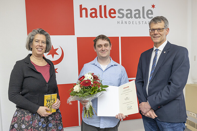 (halle.de/ps) Für seinen beispielhaften und entschlossenen Einsatz als Lebensretter in einer psychisch belastenden Situation wurde Hannes D. am heutigen Montag, 30. Januar 2023, von Sachsen-Anhalts Innenministerin Dr. Tamara Zieschang und Bürgermeister Egbert Geier in Halle (Saale) mit einer Urkunde über eine Öffentliche Belobigung ausgezeichnet. In einer äußerst schwierigen Situation hat Hannes D. Ruhe bewahrt, Erste Hilfe geleistet und damit einem Säugling das Leben gerettet: Am 21. Oktober 2022 saß er in einer Straßenbahn in Halle (Saale), in der auch eine Familie aus Wien mit Kinderwagen unterwegs war. Als der darin liegende Säugling wegen eines Fieberkrampfes aufhörte zu atmen, reagierte Hannes D. sofort: Der ausgebildete Ersthelfer begann unverzüglich mit den lebenserhaltenden Maßnahmen wie einer Herzdruckmassage. Kurz darauf zeigte der Säugling wieder Lebenszeichen. Dem kleinen Jungen ging es bald besser.