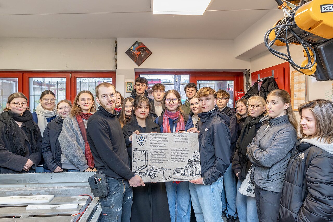 (halle.de/ps) Eine nach eigenem Entwurf gestaltete Gedenktafel für hallesche Jüdinnen und Juden, die im Nationalsozialismus nach Theresienstadt deportiert und ermordet wurden, konnten Schülerinnen und Schüler des Lyonel-Feininger-Gymnasiums am heutigen Mittwoch, 26. Februar 2025, in der Steinmetzwerkstatt Korger entgegennehmen. Die nach dem Entwurf von Schüler Lui Schneider gestaltete Steintafel wurde rund 20 Stunden lang maschinell ausgefräst. Neben einer bildlichen Darstellung enthält die Platte Text auf Deutsch, Tschechisch, Hebräisch und Englisch.