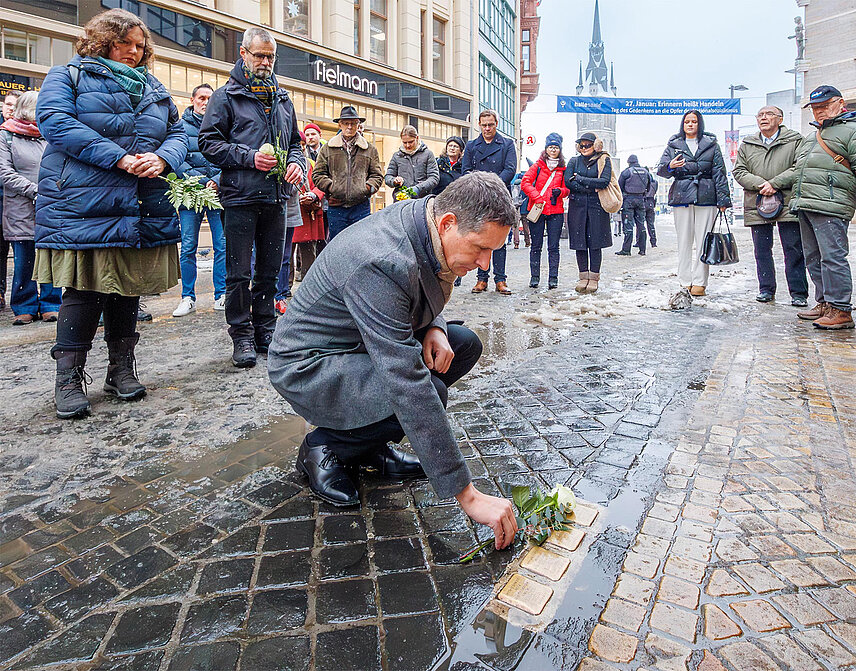 (halle.de/ps) An den vier Stolpersteinen vor dem Wohnhaus Leipziger Straße 4 wurde am Dienstag, 27. Januar 2026, anlässlich des „Tages des Gedenkens an die Opfer des Nationalsozialismus“ der Opfer gedacht. Oberbürgermeister Dr. Alexander Vogt und der Leiter der Gedenkstätte Roter Ochse, Michael Viebig, sprachen Worte des Gedenkens. Im Anschluss legten Oberbürgermeister und Gedenkstättenleiter sowie Anne Kupke-Neidhardt vom halleschen Zeitgeschichte(n)-Verein einzelne weiße Rosen nieder. In der Leipziger Straße 4 lebte die Jüdin Sofia Wenzymer und ihre Kinder, die 1938 nach Polen vertrieben wurden.