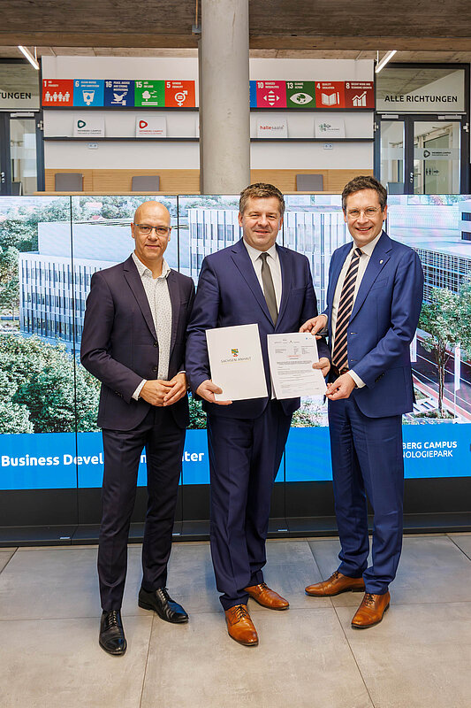 (halle.de/ps) Einen Förderbescheid in Höhe von 56,1 Millionen Euro für den Neubau des „Business Development Center“ (BDC) auf dem Weinberg Campus in Halle (Saale) haben Oberbürgermeister Dr. Alexander Vogt und Dr. Ulf-Marten Schmieder, Geschäftsführer des Technologiepark Weinberg Campus, am heutigen Mittwoch, 3. Dezember 2025, entgegengenommen. Sachsen-Anhalts Wirtschaftsminister Sven Schulze überreichte den Bewilligungsbescheid im „Innovation Hub“ des Technologie- und Gründerzentrums im Technologiepark Weinberg Campus, der sich an der Investition mit Eigenmitteln in Höhe von knapp 10 Mio. Euro beteiligt.