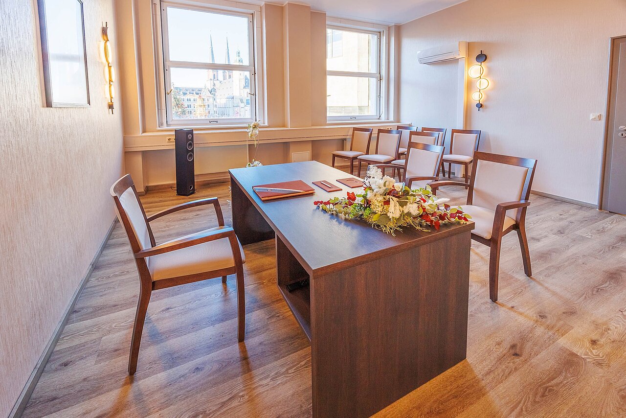 (halle.de/ps) Die Stadt Halle (Saale) hat das Kleine Trauzimmer im Ratshof am Marktplatz neugestaltet und bietet nun auch in diesem Trauzimmer Eheschließungen in einem modernen und stilvollen Ambiente an. Der Raum wurde vollständig renoviert, mit modernem und angemessenem Mobiliar und einer stimmigen Raumdekoration ausgestattet. Zusätzlich wurde eine neue Musikanlage installiert. Mit Platz für bis zu zehn Gäste ist das Trauzimmer besonders für kurzentschlossene Paare und Eheschließungen im kleinen, persönlichen Rahmen geeignet.