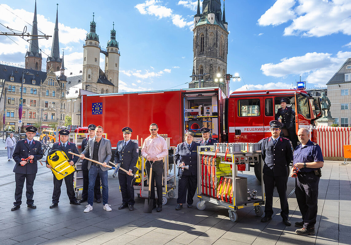 (halle.de/ps) Einen neuen „Gerätewagen Logistik“ für die Feuerwehr hat die Stadt Halle (Saale) am heutigen Donnerstag, 21. August 2025, vor dem Stadthaus auf dem Marktplatz 2 offiziell in Dienst gestellt. Die neue Technik kostet 460.000 Euro, das Land Sachsen-Anhalt fördert die Neuanschaffung mit 160.000 Euro. Vor der gemeinsamen Sitzung des Ausschusses für Planungsangelegenheiten und Stadtentwicklung und des Ausschusses für Klimaschutz, Umwelt und Ordnung haben der Leiter des Fachbereichs Sicherheit, Tobias Teschner, und Halles Feuerwehrchef Daniel Schöppe (im Foto 6. und 5. v.l.) die neue Technik den Stadträtinnen und Stadträten vorgestellt.
