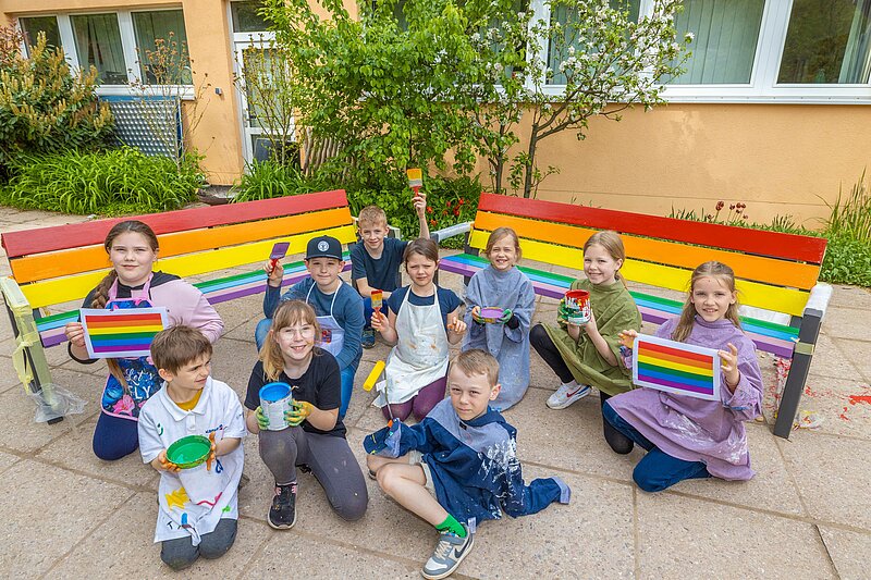 (halle.de/ps) Schülerinnen und Schüler der „Ersten Kreativitätsschule Sachsen-Anhalt e.V.“ haben jetzt zwei Sitzbänke in den Farben des Regenbogens gestaltet. Eine der beiden Bänke wird am Nasreddin-Brunnen in Halle-Neustadt aufgestellt. Sponsor hierfür ist das Neustadt-Center. Für die zweite werden noch Standort und Sponsoring gesucht.
