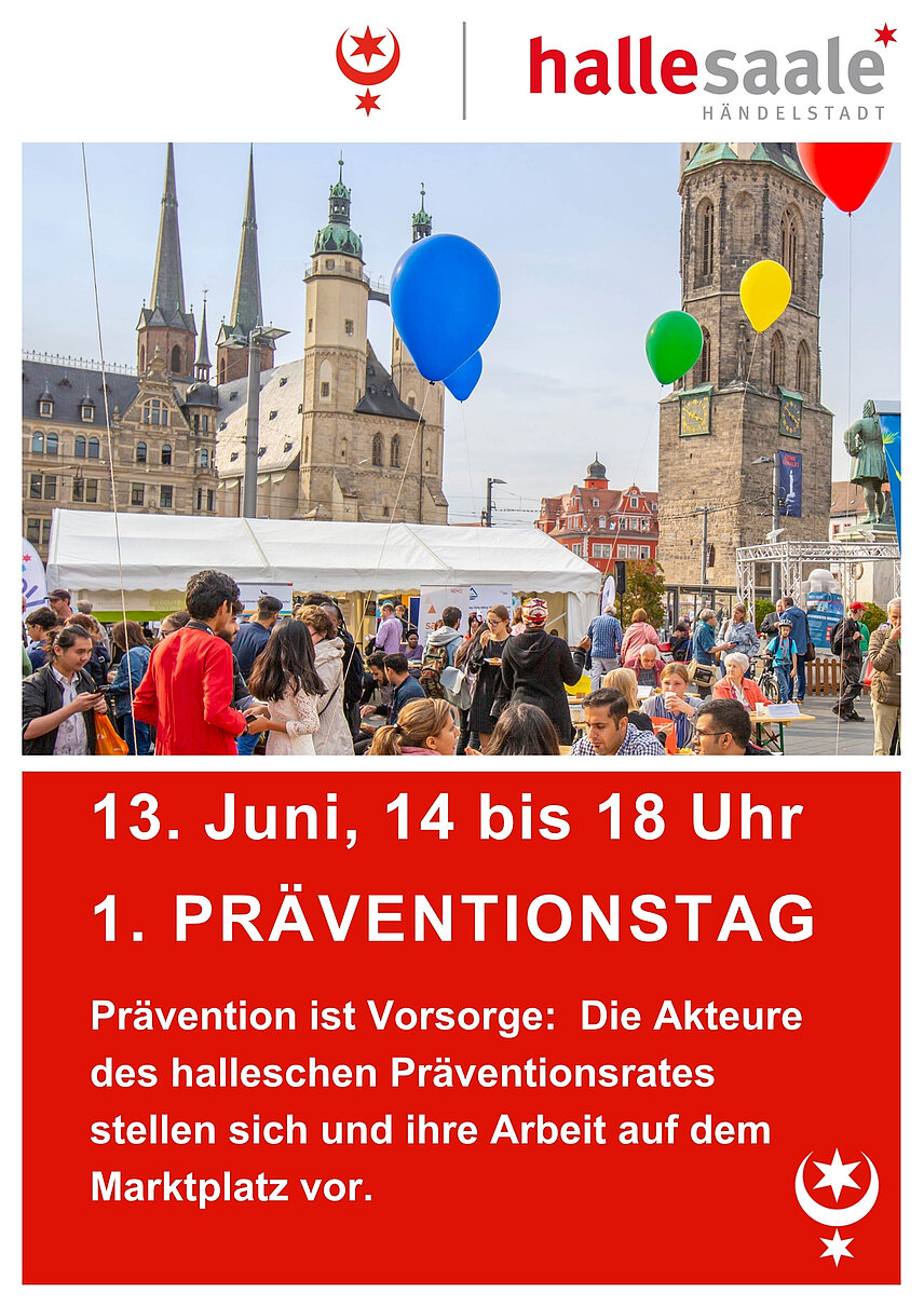 ... unter diesem Motto findet am Freitag, den 13. Juni 2025 , auf dem Marktplatz der erste Präventionstag in Halle (Saale) statt. Von 14 bis 18 Uhr präsentieren rund Projekte und Akteure aus dem Präventionsrat der Stadt ihre Arbeit und laden die Besucherinnen und Besucher dazu ein, sich zu informieren, mitzumachen und ins Gespräch zu kommen.