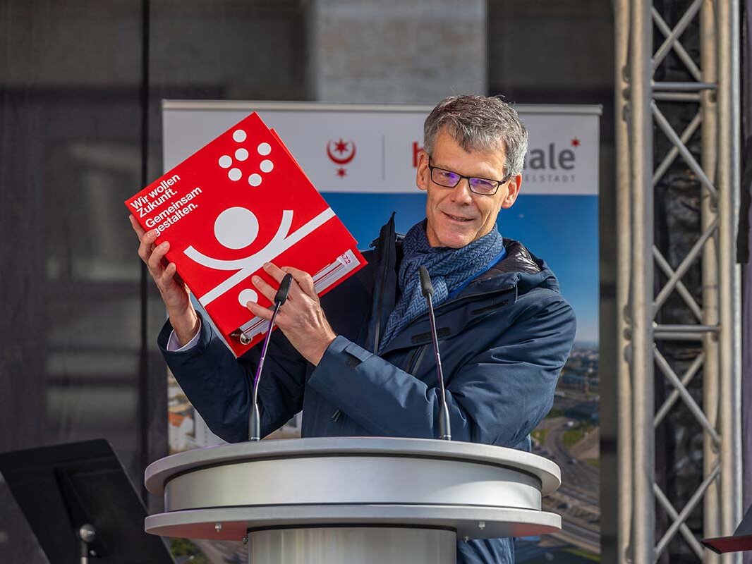 Im Jahr 2022 hat das Bundeskabinett und der Deutsche Bundestag den Beschluss zur Errichtung eines Zukunftszentrums gefasst und einen Standortwettbewerb ausgelobt. Halle hat als Standort überzeugt. Inzwischen steht der Siegerentwurf fest, Vorarbeiten für die Umgestaltung des Riebeckplatzes beginnen
